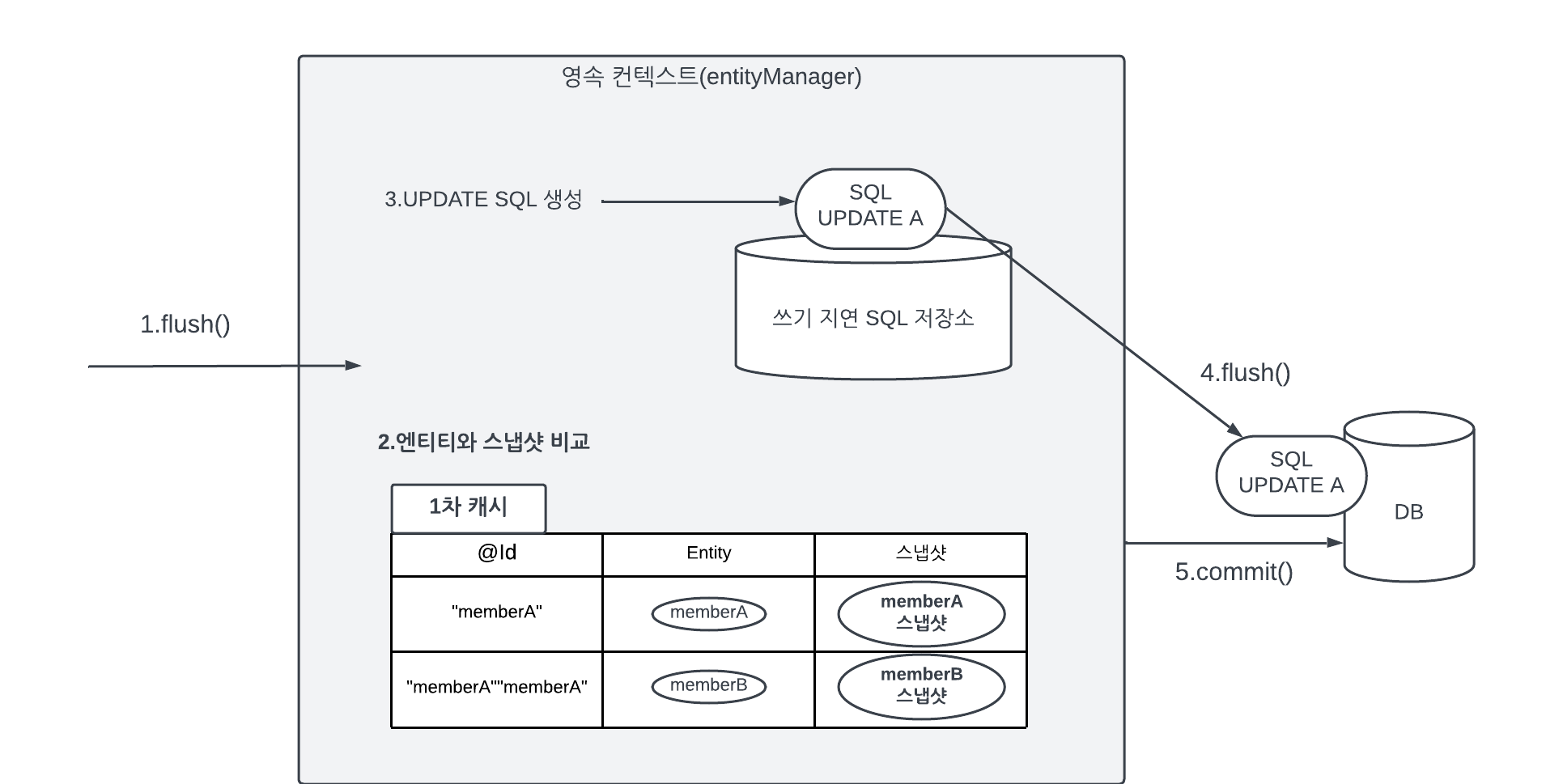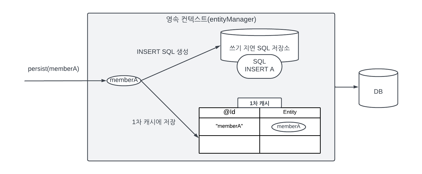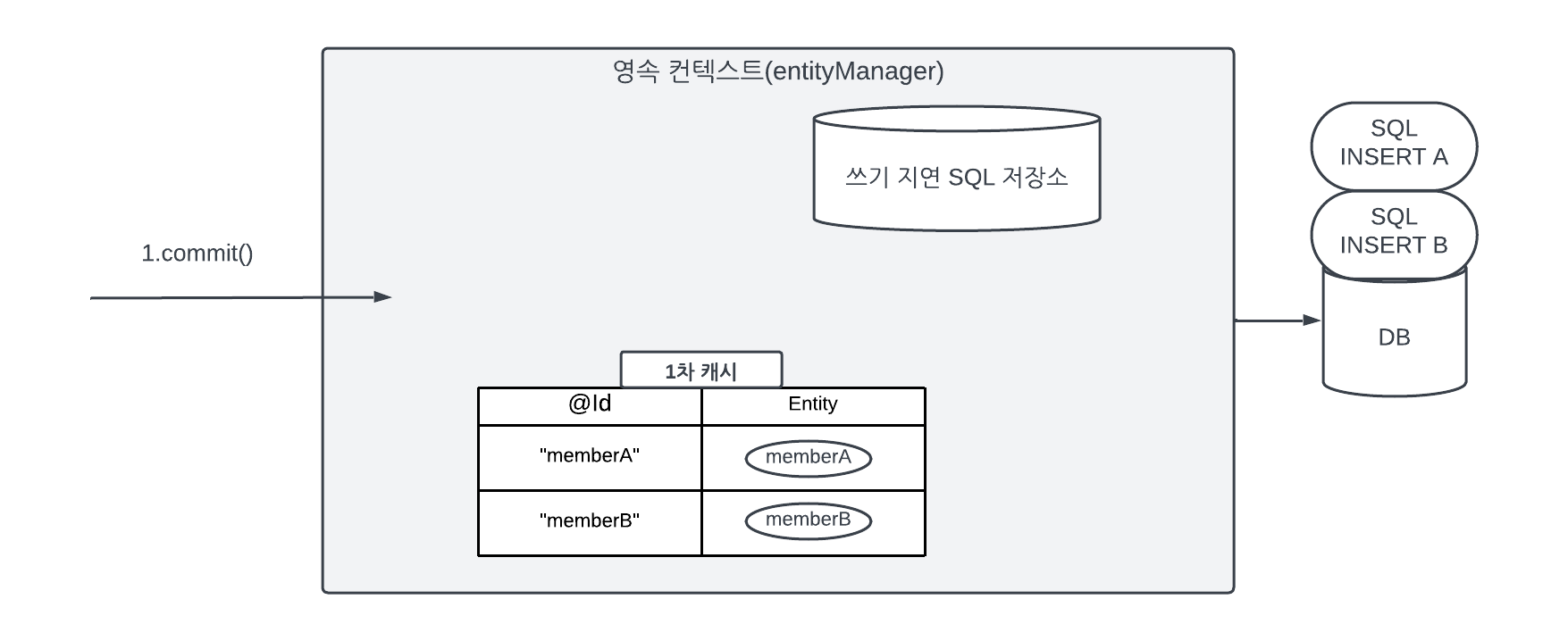 - 데이터를 저장하면 등록 쿼리를 데이터베이스에 보내지 않고 메모리에 모아둔다. 그리고 트랜잭션을 커밋할 때 모아둔 등록 쿼리를 데이터베이스에 보낸 후 커밋힌다.
