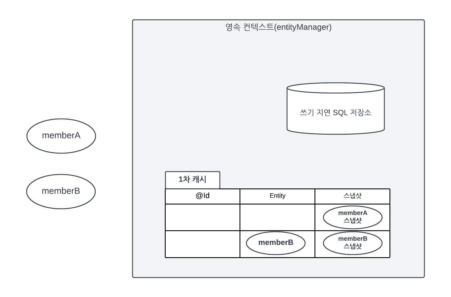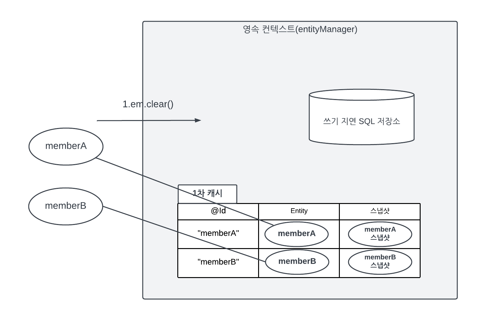 그림 3.15 영속성 컨텍스트 초기화 후 영속성 콘테스트 초기화 전 → 영속성 콘테스트 초기화 후 영속성 컨텍스트에 있는 모든 것이 초기화되어 버렸다. 이것은 영속성 컨텍스트를 제거하고 새로 만든 것과 같다. 이제 memberA, memberB는 영속성 컨텍스트가 관리하지 않으므로 준 영속 상태이다.