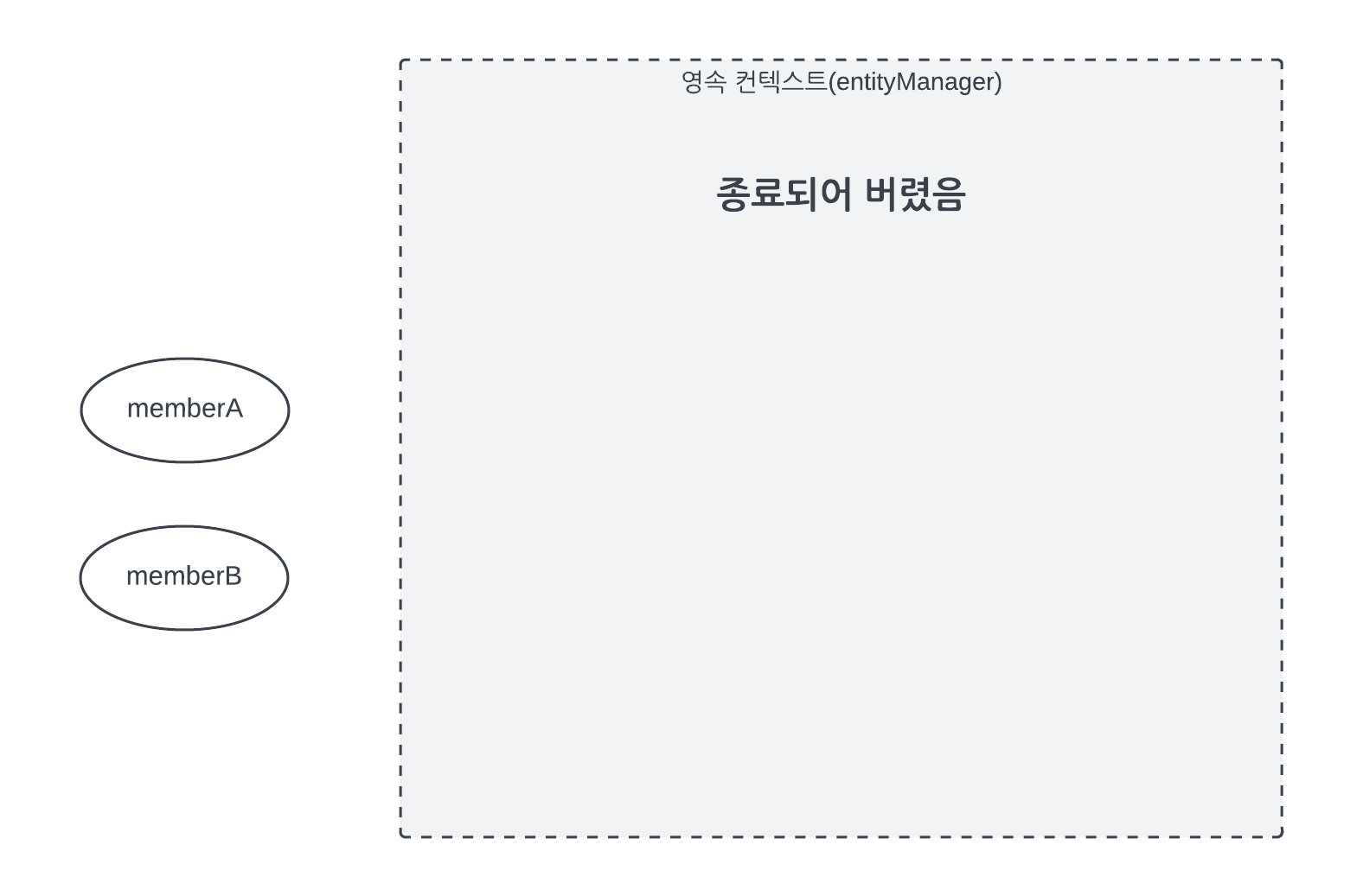 영속성 컨텍스트가 종료되어 더는 memberA, memberB가 관리되지 않는다.
