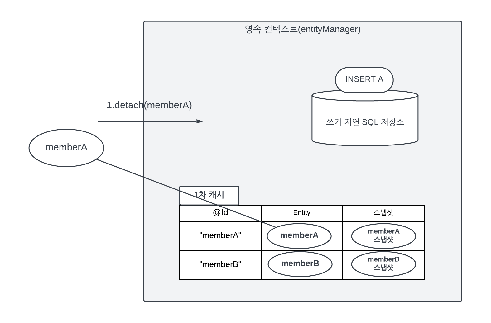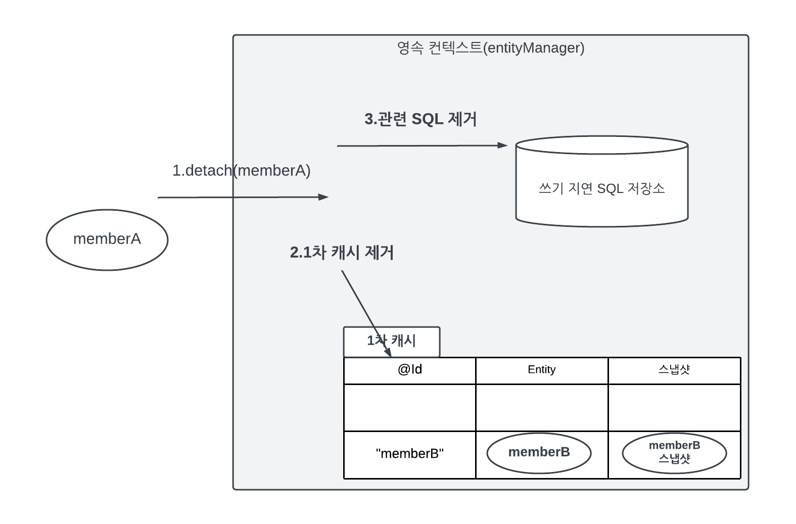 public void testDetached(){ ... //회원 엔티티 생성, 비영속 상태 Member member = new Member(); member.setId("memberA"); member.setUsername("회원A"); //회원 엔티티 영속 상태 em.persist(member); //회원 엔티티를 영속성 컨텍스트에서 분리, 준영속 상태 em.detach(member); transaction.commit(); 트랜잭션 커밋 }위 예제 코드를 보면 먼저 회원 엔티티를 생성하고 영속화 한 다음 em.detach(member)를 호출했다. 영속성 컨텍스트에게더는 해당 엔티티를 관리하지 말라는 것이다. 이 메소드를 호출하는 순간 1차 캐시부터 쓰기 지연 SQL 저장소까지 해당 엔티티를 관리하기 위한 모든 정보가 제거된다.
