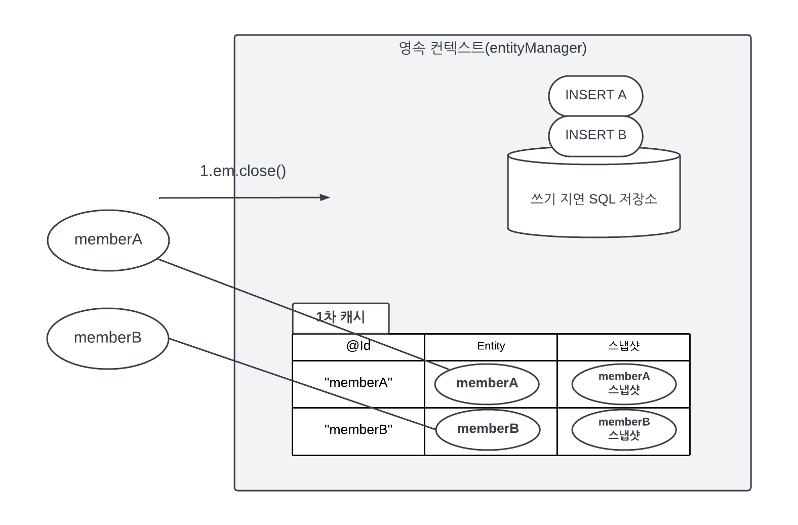 @Transactional public void closeEntityManager(EntityManager em){ Member memberA = em.find(Member.class,"memberA"); Member memberB = em.find(Member.class,"memberB"); em.close(); }1. 영속성 컨텍스트 제거
