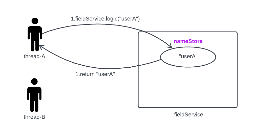 threadA.start()메서드를 실행하면 Runable 인터페이스형의 인스턴스 userA에 정의된 run메서드의 실행내용이 실행된다.그럼 1)fieldService.logic()이 실행되면서 logic의 파라미터로 "userA"가 넘어간다. 2)처음에 넘어옴 nameStore은 값은 null이다. 3)이후 nameStore필드에 "userA"값을 대입한다. 그 4)다음 다시 nameStore가 log에 출력된다. 그때 nameStore 필드에 값은 userA이다.