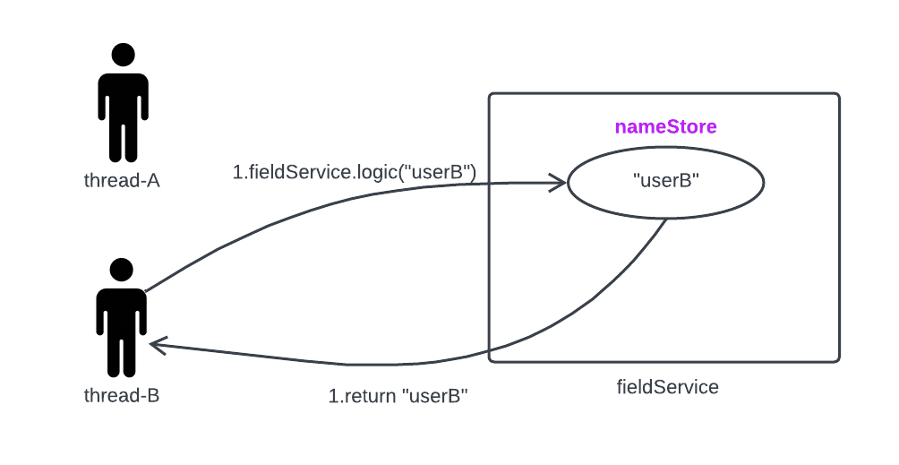 - thread-A의 호출이 끝나면서 nameStore의 결과를 반환 받는데, 이때 nameStore는 앞의 2번에서 userB의 값으로 대체되었다 따라서 기대했던 userA의 값이 아니라 userB의 값이 반환된다.