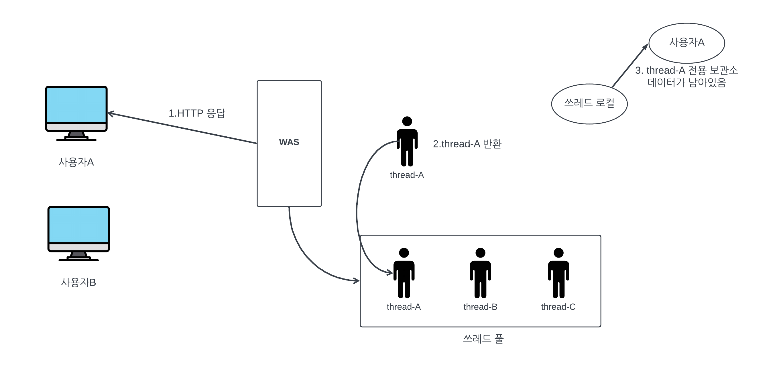 - thread-A는 쓰레드풀에 아직 살아있다 따라서 쓰레드 로컬의 thread-A전용 보관소에 사용자A 데이터도 함께 살아있게 된다.