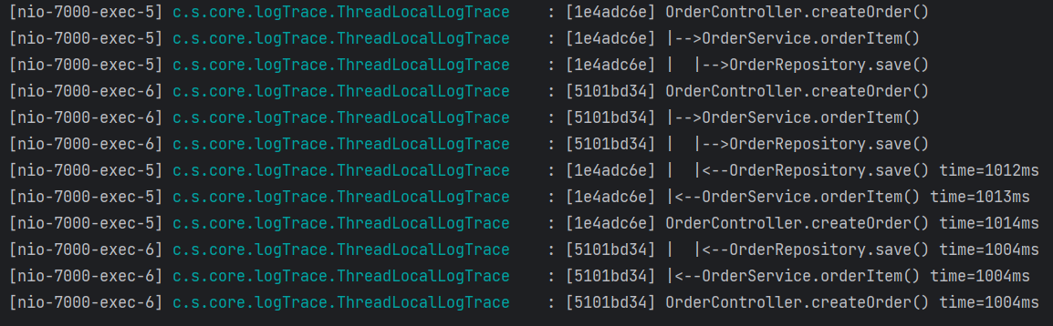 로그를 확인해보면 각각의 쓰레드 nio-7000-exec-5, nio-7000별도 로그가 정확하게 나누어진 것을 확인할 수 있다.