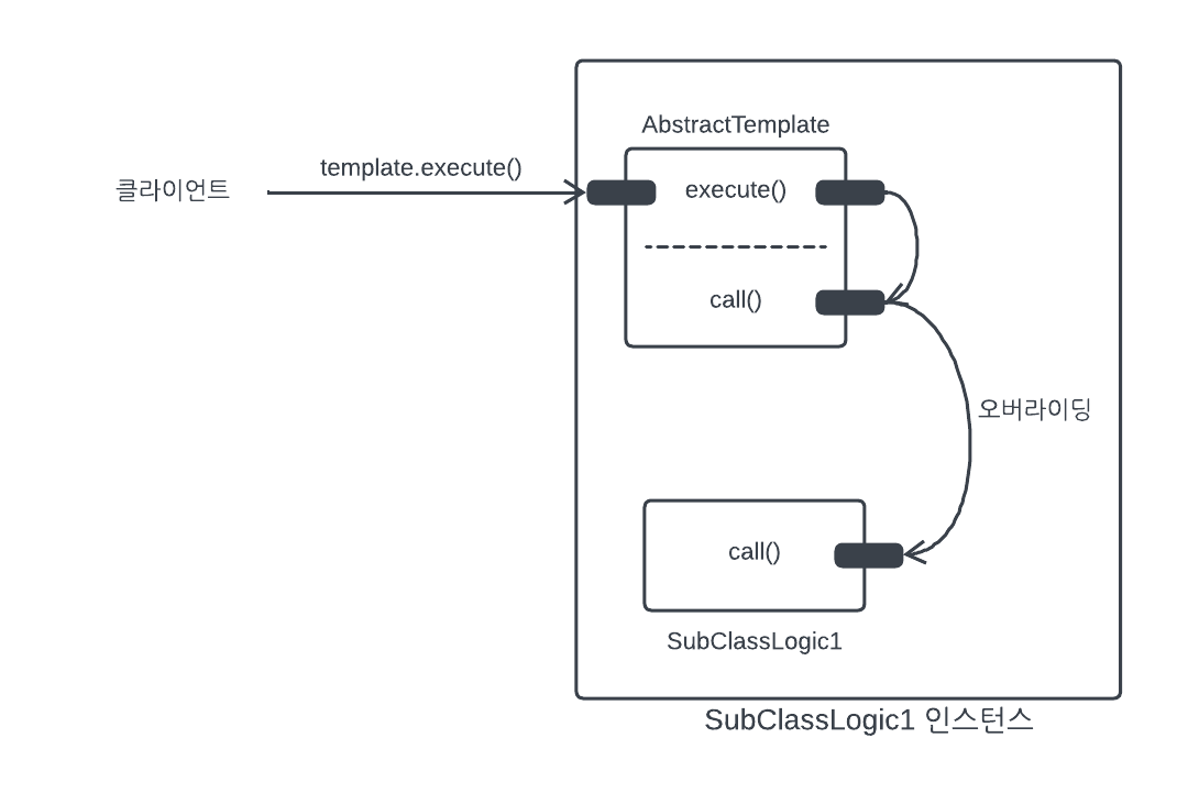 template1.execute()를 호출하면 템플릿 로직인 AbstractTemplate.execute()를 실행한다. 여기서 중간에 call() 메서드를 호출하는데 이 부분이 오버라이딩 되어 있다. 따라서 현재 인스턴스인 subClassc1 인스턴스의 SubClassLogic.call()메서드가 호출된다.