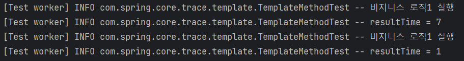 @Slf4j public class TemplateMethodTest { @Test void templateMethodV0(){ logic1(); logic2(); } private void logic1(){ long startTime = System.currentTimeMillis(); //비지니스 로직 실행 log.info("비지니스 로직1 실행"); //비지니스 로직 종료 long endTime = System.currentTimeMillis(); long resultTime = endTime - startTime; log.info("resultTime = {}",resultTime); } private void logic2(){ long startTime = System.currentTimeMillis(); //비지니스 로직 실행 log.info("비지니스 로직1 실행"); //비지니스 로직 종료 long endTime = System.currentTimeMillis(); long resultTime = endTime - startTime; log.info("resultTime = {}",resultTime); } }logic1(), logic2() 를 호출하는 단순한 테스트 코드이다.