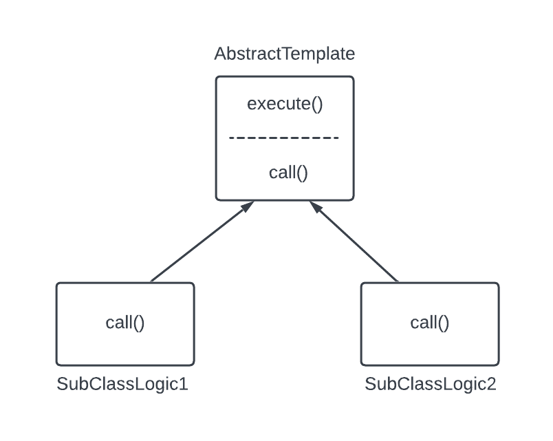 추상템플릿에 변하지 않는 로직들을 다 몰아 넣는다. 그리고 변하는 부분을 의미하는 메서드를 (위 그림에서는 call()이다.) 만든다. 그리고 call() 메서드는 오버라이딩해서 자식 클래스에서 구현하도록 구성한다.