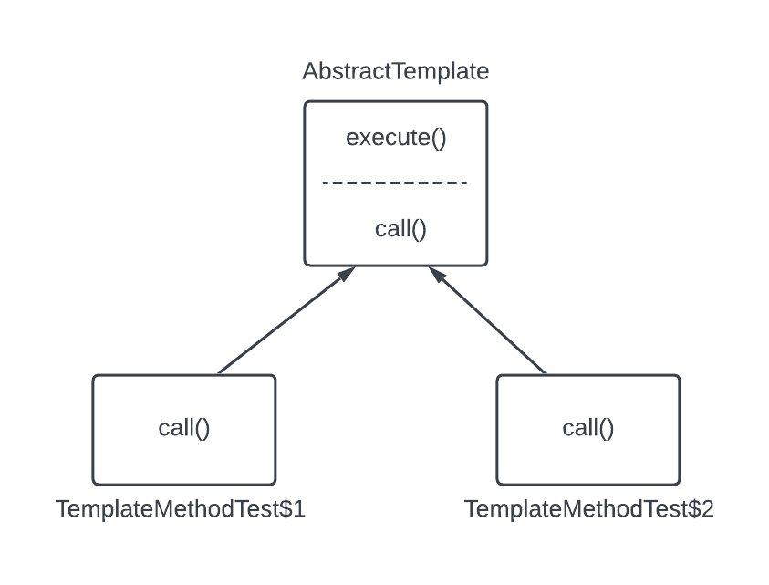 실행 결과를 보면자바가 임의로 만들어주는 익명 내부클래스의 이름은 TemplateMethodTest$1, TemplateMethodTest$2인 것을 확인할 수 있다. TemplateMethodTest 클래스 안에서 익명 클래스로 정의되었기 때문에 자바가 임의로 클래스 이름을 만들어 준것이다.