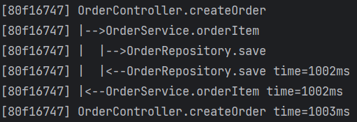 @Service @RequiredArgsConstructor public class OrderServiceV4 { private final OrderRepositoryV4 orderRepository; private final LogTrace trace; public void orderItem(String itemId){ AbstractTemplate<Void> template = new AbstractTemplate<>(trace) { @Override public Void call() { orderRepository.save(itemId); return null; } }; template.execute("OrderService.orderItem()"); } }- AbstractTemplate<Void>