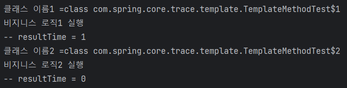 /** * 템플릿 메서드 패턴, 익명 내부 클래스 사용 */ @Test void templateMethodV2(){ //익명내부 클래스로 // 객체를 생성하는 동시에 구현할 수 있다. //즉 추상 클래스를 상속 받은 클래스를 바로 만들 수 있다. AbstractTemplate template1 = new AbstractTemplate() { @Override protected void call() { log.info("비지니스 로직1 실행"); } }; log.info("클래스 이름1 ={}",template1.getClass()); template1.execute(); AbstractTemplate template2 = new AbstractTemplate() { @Override protected void call() { log.info("비지니스 로직2 실행"); } }; log.info("클래스 이름2 ={}",template1.getClass()); template1.execute(); }실행결과
