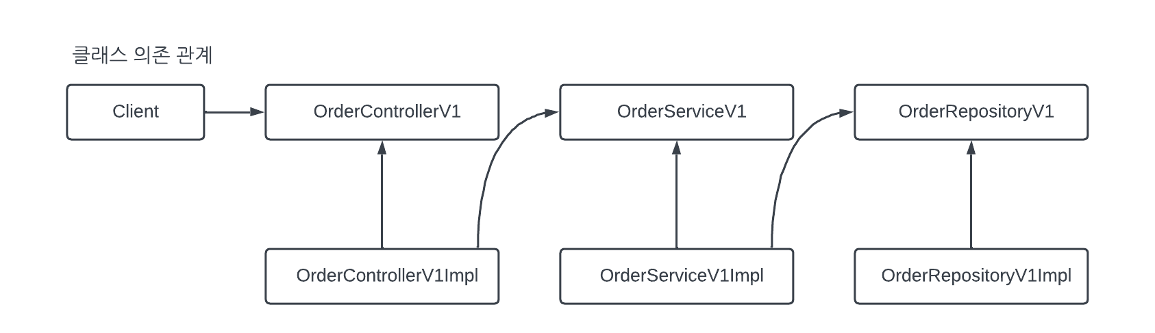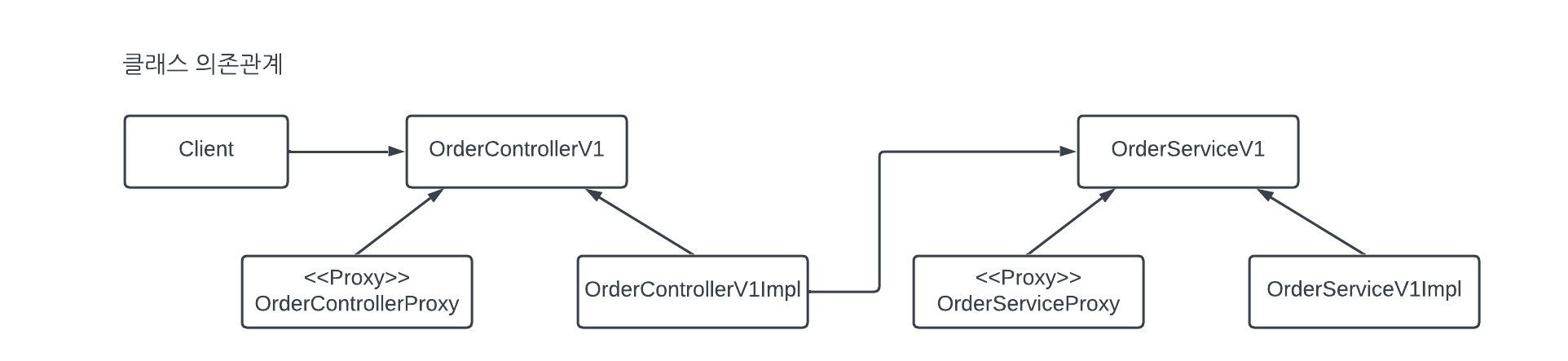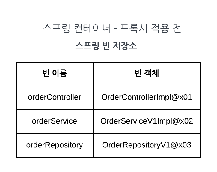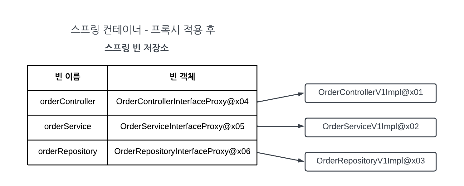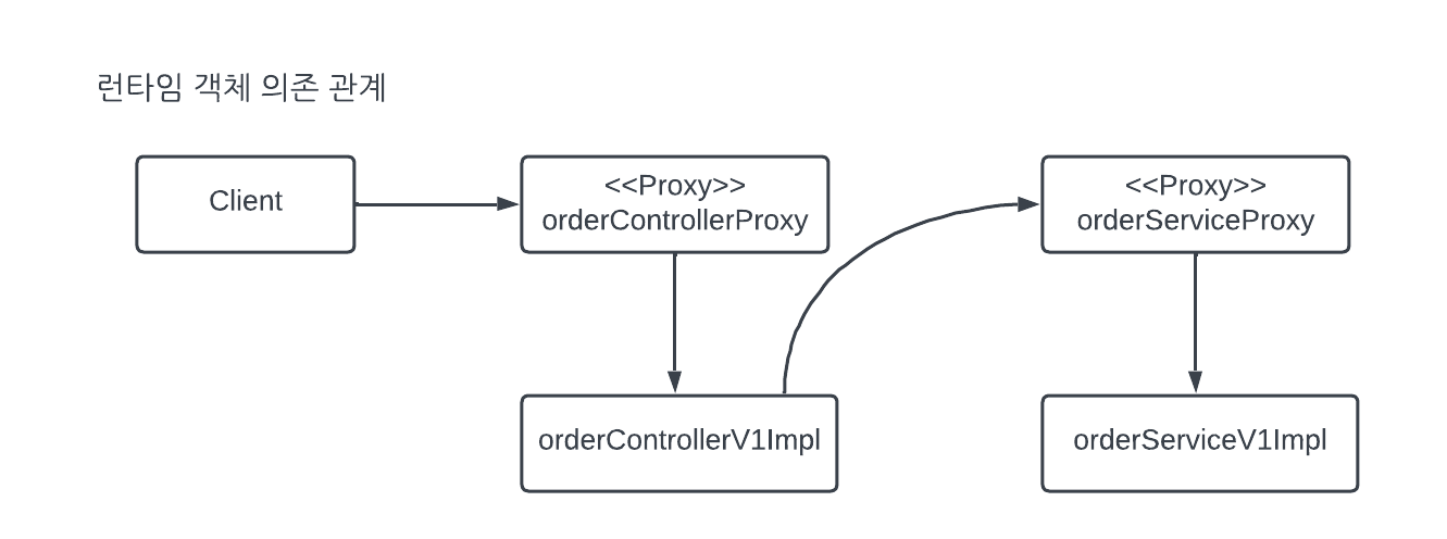- 이제 프록시의 런타임 객체 의존 관계를 설정하면 된다. 기존에는 스프링 빈이 orderControllerV1Impl, orderServiceV1Impl같은 실제 객체를 반환(스프링 @Bean으로 실제 객체를 등록)했다. 하지만 이제는 프록시를 사용한다. 따라서 프록시 객체 인스턴스를 생성하고 프록시를 실제 스프링 빈 대신 등록한다. 실제 객체는 스프링 빈으로 등록하지 않는다.