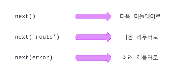 - next에 파라미터로 값을 넣으면 에러 핸들러로 넘어간다.('route'인 경우 다음 라우터로)