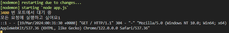 const express = require('express'); const path = require('path'); const morgan = require('morgan') const app = express(); app.set('port',process.env.PORT||3400); app.use((req, res,next) => { console.log('모든 요청에 실행하고 싶어요1'); next(); }); app.use(morgan('dev')); app.get('/',(req, res, next) => { res.send("hellp express"); });