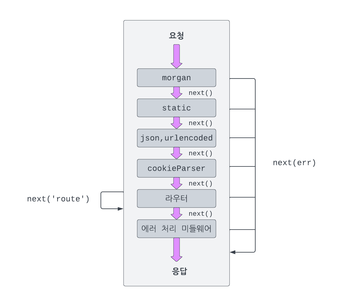 // 보통의 순서 app.use(morgan('dev')); app.use('/',express.static(path.join(__dirname,'static'))); app.use(cookieParser('dote10password')); app.use(express.json()); app.use(express.urlencoded({extended:true})); // 로그인을 통한 접근 제어 순서 app.use(morgan('dev')); app.use(cookieParser('dote10password')); app.use(session()); app.use('/',express.static(path.join(__dirname,'static'))); app.use(express.json()); app.use(express.urlencoded({extended:true}));또 mogan과 body-parser와 같은 미들웨어는 default 상태가 내부적으로 next() 메서드를 실행하고 있는 것과 다른게 static 미들웨어는 default로 실행하는것이 아니라 요청한 url과 매칭되는 static 리소스를 가지고 있지 않을 때 next() 메서드가 호출된다. 따라서 정적파일만을 요청할 경우에는 다른 미들웨어를 거치는 것 보다 우선적으로 static 미들웨어에 우선적으로 접근하는 것이 좋기 때문에 해당 미들웨어는 소스코드에서 보통 morgan 미들웨어 다음에 위치하게 된다.