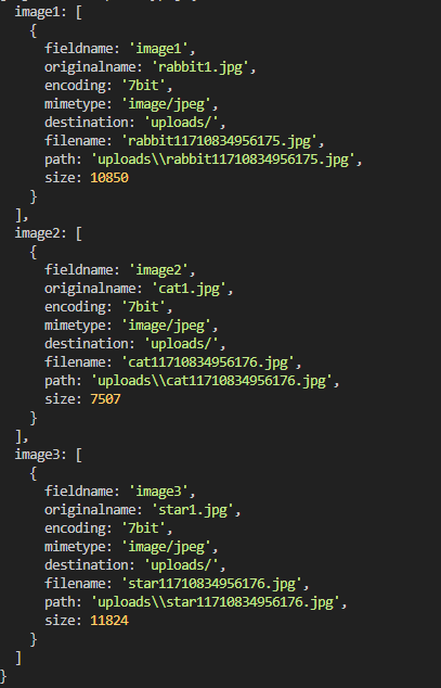 <!DOCTYPE html> <html lang="ko"> <head> <meta charset="UTF-8"> <meta name="viewport" content="width=device-width, initial-scale=1.0"> <title>Document</title> </head> <body> <h1>multer</h1> <form id="form" action="/upload/fields" method="post" enctype="multipart/form-data"> <input type="file" name="image1" /> <input type="file" name="image2" /> <input type="file" name="image3" /> <input type="text" name="title"> <button type="submit">업로드</button> </form> </body> </html>app.post('/upload/field',upload.fields([{name:'image1'},{name:'image2'},{name:'image3'}]), (req,res)=>{ console.log(req.files); res.send('ok'); });file 타입의 input 태그 자체가 여러개일 경우에는 서버단에서 upload.array()를 사용하는 것이 아니라, upload.fields() 미들웨어를 사용하고 파라미터로 위코드와 같이 key가 name인 객체를 배열 형태로 넣어준다.