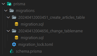 /* Warnings: - You are about to drop the `Article` table. If the table is not empty, all the data it contains will be lost. */ -- DropTable DROP TABLE `Article`; -- CreateTable CREATE TABLE `articles` ( `id` INTEGER NOT NULL AUTO_INCREMENT, `title` VARCHAR(191) NOT NULL, `content` VARCHAR(191) NOT NULL, `state` ENUM('DRAFT', 'PUBLISHED') NOT NULL, `createdAt` DATETIME(3) NOT NULL DEFAULT CURRENT_TIMESTAMP(3), `updatedAt` DATETIME(3) NOT NULL, PRIMARY KEY (`id`) ) DEFAULT CHARACTER SET utf8mb4 COLLATE utf8mb4_unicode_ci;prisma 폴더 하위를 살펴보면 그동안 npx prisma migrate dev 명령어를 사용해서 생성된 쿼리를이 저장되어 있는 것을 확인할수 있다. Article 테이블을 articles 테이블로 이름을 수정할 때 생성된 쿼리도 확인할 수 있다.