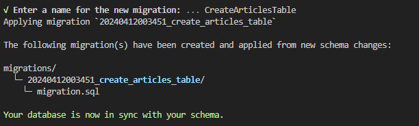 model Article{ id Int @id @default(autoincrement()) title String content String state ArticleState createdAt DateTime @default(now()) updatedAt DateTime @updatedAt @@map("articles") }마이그레이션 명령어