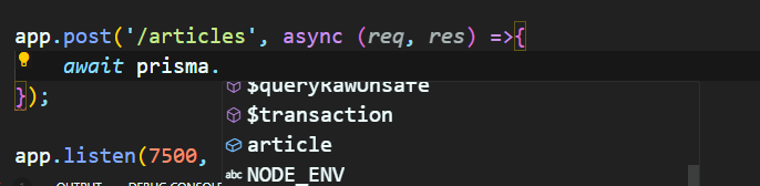 코드에 prisma. 만 입력해도 자동완성 추천 항목에 article이 제안되는 것을 확인할 수 있다.