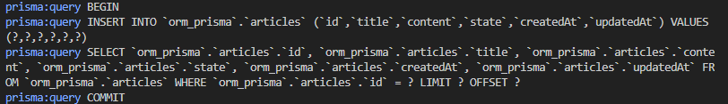 위 설정 사항을 설정하고 나서 post './articles'를 실행하면 해당 해당 메소드가 작동하면서 실행된 쿼리가 기록된다. 따라서 prisma ORM 이 제공하는 메소드를 사용하면서 실제 실행된 쿼리를 제대로 추적하고 디버깅할 수 있게된다.
