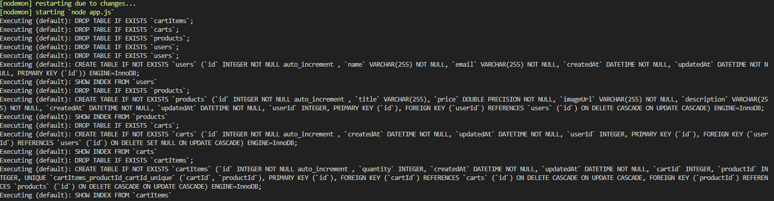 through 속성을 통해 시퀄라이즈에게 Cart와 Product의 관계를 연결시켜주는 모델(테이블)을 알려준다. 다시 임시로 sync({force:true})로 설정을 바꾸로 재시작하면 위와 같이 모든 테이블이 Drop 된 뒤에 모델 설정대로 새롭게 테이블을 생성시킨 쿼리문 출력을 확인할 수 있다.