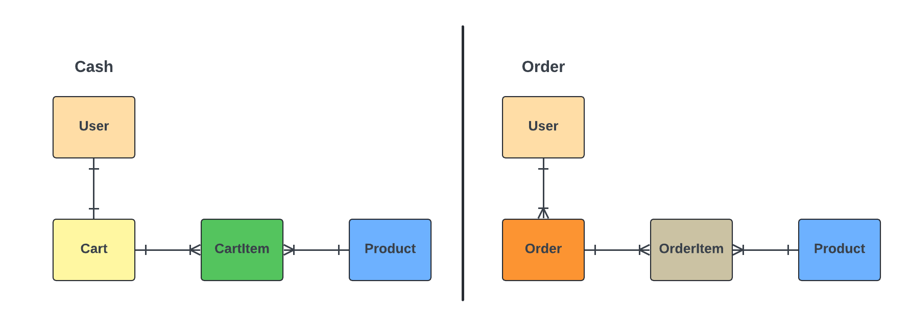 Order은결국 여러개의 Product 와 한명의 User사이의 관계테이블이이된다. 때문에 Order 테이블도 Cart와 마찬가지고 Product에 대한 정보와 Product에 대한 수량 정보가 필요하다. 또한 Cart 테이블이 해당정보를 CartItem 라는 Product 와 의 조인 테이블에 컬럼에 기록하게 한거 처럼 Order 테이블도 Product와의 관계를 기록하는 OrderItem 테이블을 만든다.