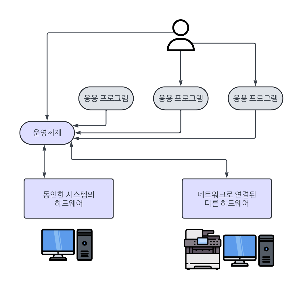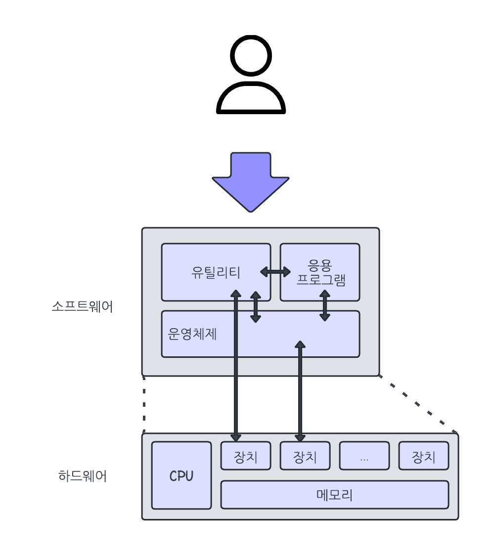 - 하드웨어 - 기본 연산 자원을 제공하는 프로세서(CPU:중앙처리장치), 메모리, 주변장치 등으로 구성된다.