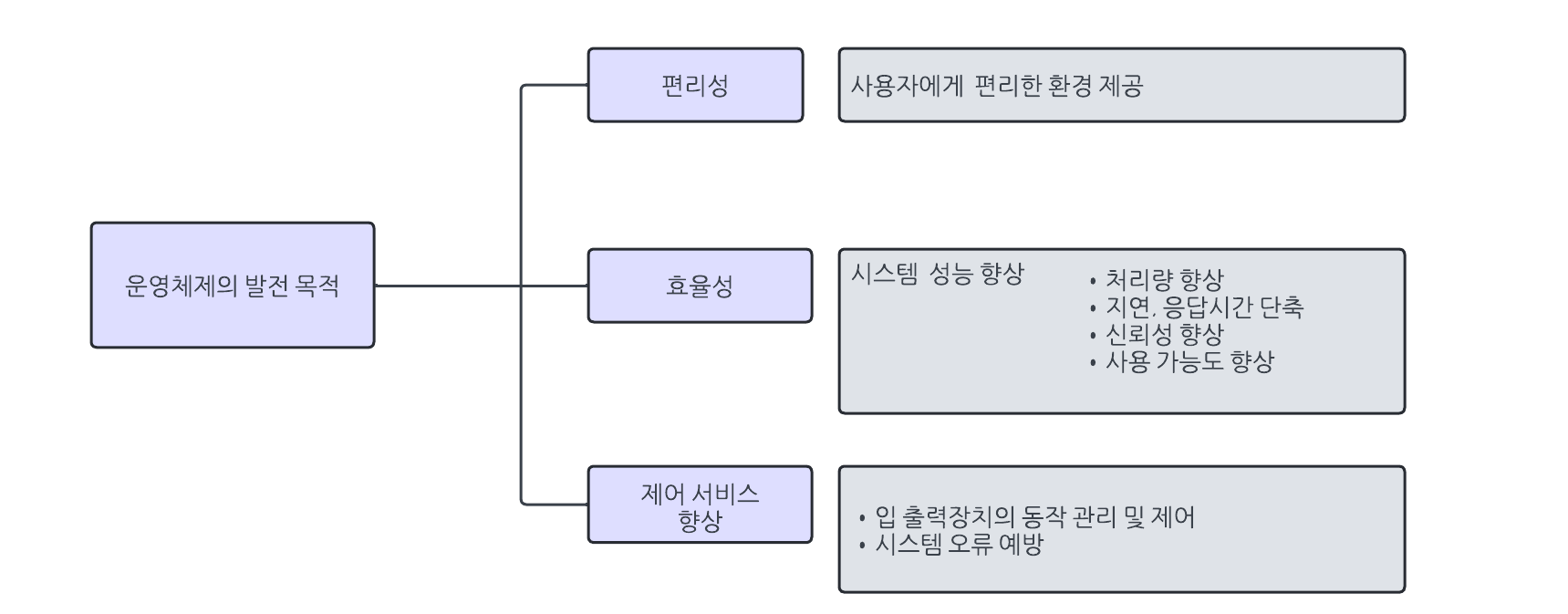 운영체제의 목적을 알면 운영체제의 설계 목표와 기능, 운영체제를 배우는 이유를 이해할 수 있다. 운영체제는 크게 다음 세 가지 목적으로 발전해 왔다. 이 중 편리성과 효율성 목적은 서로 상반될 수 있는데, 과거에는 편리성보다는 효율성을 중요시하여 대부분 운영체제 이론은 컴퓨터 자원의 최적 이용에 3더 관심을 기울였다.