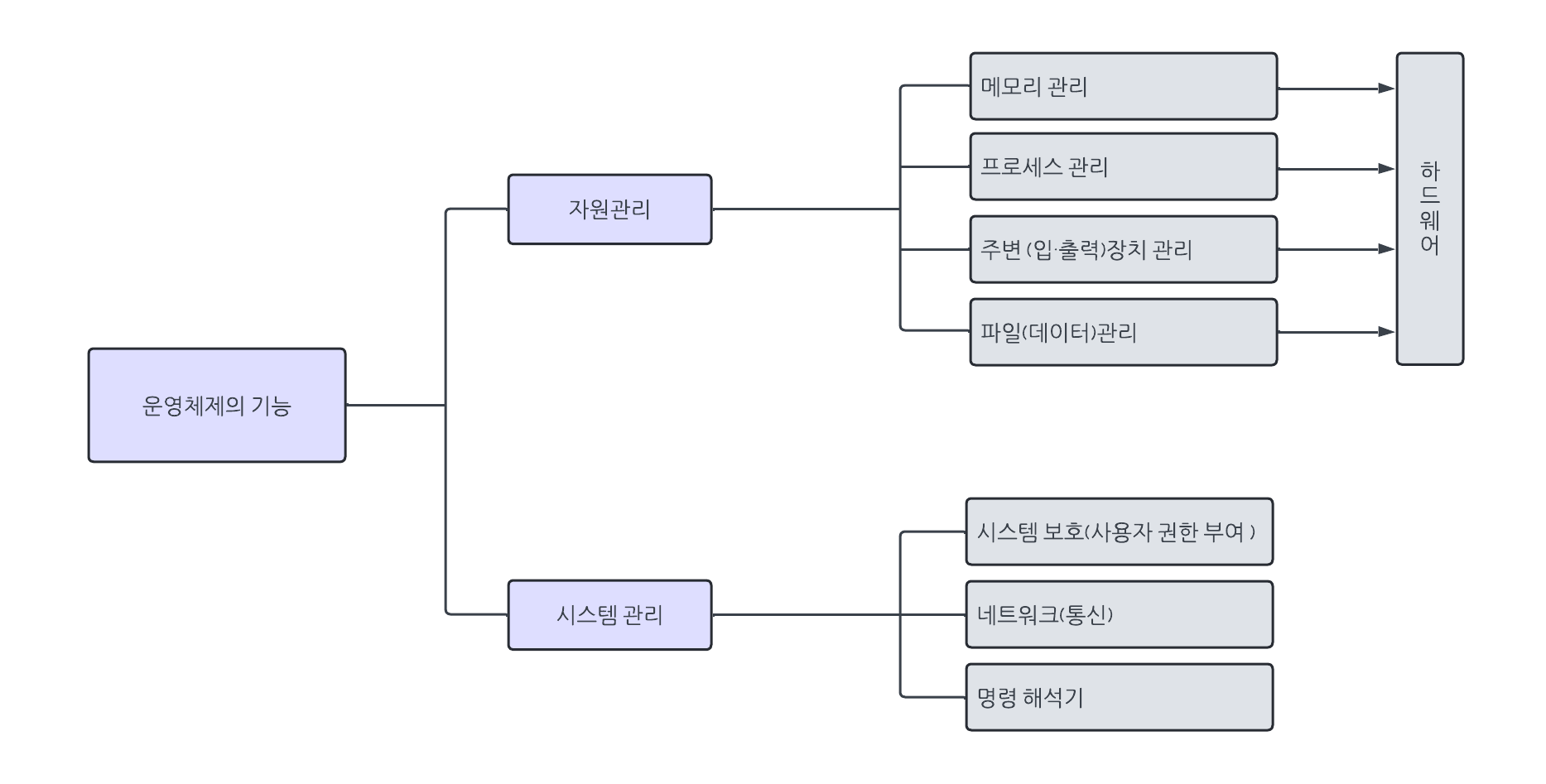 운영체제는 다양한 역할을 수행하고 그에 따라 제공하는 기능도 다양하다. 주요 기능을 크게 자원관리과 시스테 관리로 분류한다.