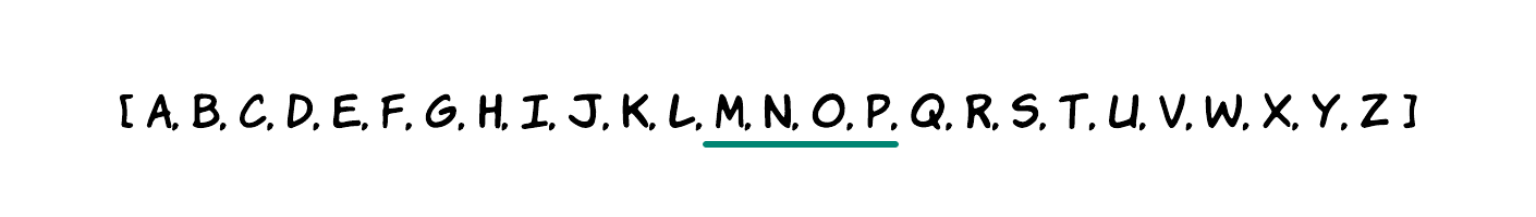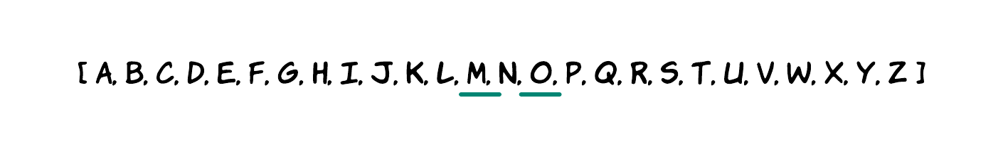 let states = [ "Alabama", "Alaska", "Arizona", "Arkansas", "California", "Colorado", "Connecticut", "Delaware", "Florida", "Georgia", "Hawaii", "Idaho", "Illinois", "Indiana", "Iowa", "Kansas", "Kentucky", "Louisiana", "Maine", "Maryland", "Massachusetts", "Michigan", "Minnesota", "Mississippi", "Missouri", "Montana", "Nebraska", "Nevada", "New Hampshire", "New Jersey", "New Mexico", "New York", "North Carolina", "North Dakota", "Ohio", "Oklahoma", "Oregon", "Pennsylvania", "Rhode Island", "South Carolina", "South Dakota", "Tennessee", "Texas", "Utah", "Vermont", "Virginia", "Washington", "West Virginia", "Wisconsin", "Wyoming" ]; console.log(states[24]); //Missouri이제 어떤 사용자가 주(state)에 해당하는 필드에 오리건(Oregon)을 입력했다고 가정하자. states 배열이 알파벳순으로 분류가 되어 있기 때문에 이진 검색을 할 때 이 배열의 중간점(halfway point)을 선택한다.