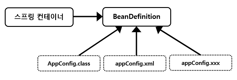 - 스프링 컨테이너는 자바코드인지,XML인지 몰라도 된다. 오직BeanDefinition만 알면 된다.