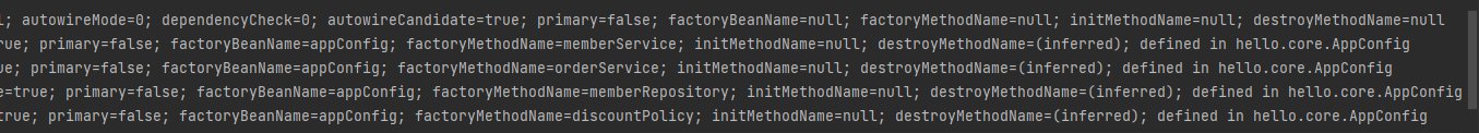 public class BeanDefinitionTest { GenericXmlApplicationContext ac= new GenericXmlApplicationContext("appConfig.xml"); @Test @DisplayName("빈 설정 메타정보 확인") void findApplicationBean(){ String[] beanDefinitionNames = ac.getBeanDefinitionNames(); for(String beanDefinitionName : beanDefinitionNames){ BeanDefinition beanDefinition = ac.getBeanDefinition(beanDefinitionName); if(beanDefinition.getRole() == BeanDefinition.ROLE_APPLICATION){ System.out.println("beanDefinitionName = " + beanDefinitionName + "beanDefinition = "+beanDefinition ); } } } }