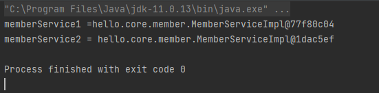 public class SingletonTest { @Test @DisplayName("스프링 없는 순수한 DI 컨테이너") void pureContainer(){ AppConfig appConfig = new AppConfig(); //1. 조회 : 호출할 때 마다 객체를 생성 MemberService memberService1 = appConfig.memberService(); //2. 조회 : 호출할 때 마다 객체를 생성 MemberService memberService2 = appConfig.memberService(); //참조값이 다른 것을 확인 System.out.println("memberService1 =" +memberService1); System.out.println("memberService2 = "+memberService2); } }