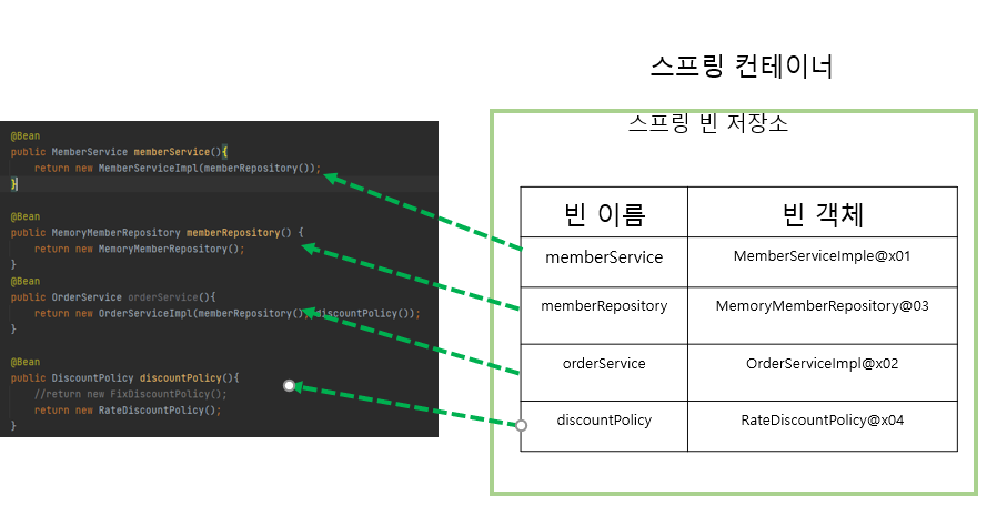 스프링 컨테이너가 빈객체를 미리 등록해서 관리해준다. 즉 객체 인스턴스를 미리 생성해 놓고 관리해준다. 조회하면 관리되는 객체 인스턴스를 조회해 준다. 두번 조회하면 이미 관리되면 객체 인스턴트를 반환해 준다.