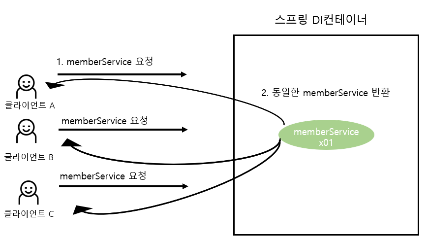 참고 : 스프링의 기본 빈 등록 방식은 싱클톤이지만, 싱글톤 방식만 지원하는 것은 아니다. 요청할 때 마다 새로운 객체를 생성해서 반환하는 기능도 제공한다. 자세한 내용은 뒤에 빈 스코프에서 설명